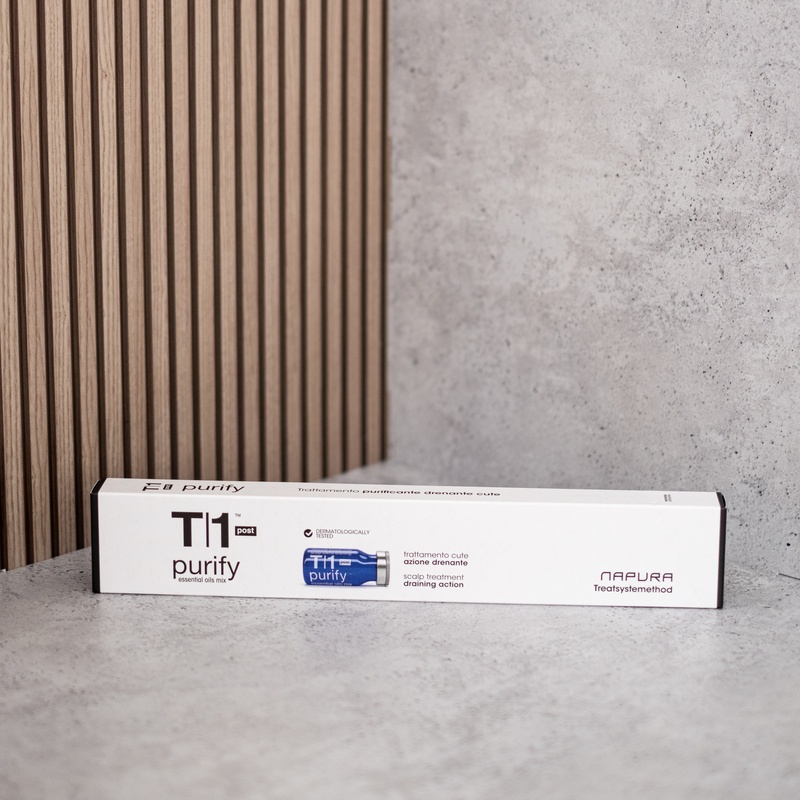 T1 Purify Post — ампульный пост-детокс для кожи головы, завершающий этап глубокого очищения, выводит токсины и запускает лимфодренаж, восстанавливая комфорт и эластичность. Благодаря комплексу Zinc PCA, эфирным маслам эвкалипта, розмарина, можжевельника и экстрактам березы, центеллы, гамамелиса, крамерии и крапивы средство нормализует себум, тонизирует микроциркуляцию и создает условия для здорового роста волос. Результат — свежие легкие корни, сбалансированная кожа и ощутимо более «живые» волосы; идеально после T1 Purify Pre или как интенсивный курс для жирной/комбинированной кожи головы.